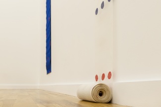 Viallat’s work embodies Supports/Surfaces’ animating tension between the systematic interrogation of painting’s essential components, on the one hand, and a radical imbrication of the work into the world, on the other. Dolla organized bands of color and polka dots on strips of thin muslin fabric and hung them from the ceiling in works like Tarlatane, 1970. It is as if the series liberates Barnett Newman’s “zips” from the constraints of the frame and stretcher. He also made a point of painting on everyday materials such as handkerchiefs and dishtowels. In Supports/Surfaces, the found object is never presented on its own, as in the Duchampian readymade. Rather, it substitutes for a constituent, functional element, becoming surface, support or both at once. Painted in acrylic on a dishtowel, Dolla’s Torchon, 1971, delicately frames three black polka dots with vertical red lines. On either side of this central composition, at the edges of the fabric, are arrays of other dots, cascading vertically. This experimentation extended to modes of display. In 1969, Lepage curated Coaraze ’69, in a village some 25 miles inland from Nice; works were displayed in and around the town, in public space. Between June and August 1970, Viallat and Lepage organized Intérieur/Extérieur, a series of ephemeral, outdoor installations on France’s Mediterranean coast. The artists designated these settings as “neutral,” beyond the reach of institutions. In keeping with their anti-authorial stance, works were not attributed to individuals.