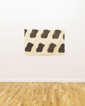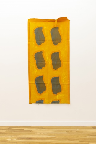 The majority of Supports/Surfaces artists hailed from the South of France, from cities such as Montpellier, Nîmes and Nice, which lent the group an outsider status relative to Paris. Several of them showed together in Impact 1 at Musée de Céret in 1966, the first of a series of foundational exhibitions curated by Viallat and poet and critic Jacques Lepage. This show included key influences on Supports/Surfaces such as Arman and Ben Vautier, representatives of Nouveau Réalisme’s interest in found objects and the street, and Daniel Buren, who would devise a strict painting system with the BMPT group one year later. Viallat taught at Nice’s Ecole des Arts Décoratifs between 1964 and 1968, and pioneered Supports/Surfaces’ process-driven, anti-compositional strategies. In 1966, he arrived at a signature technique, repeating a softened rectangular form, via stencil, into gridded patterns that could extend over the entirety of a painterly surface, as exemplified in 1970/053, 1970, on view in this show. Here the artist’s use of black carbonyl leaks oil beyond the form delimited by the stencil, making it doubly “soft” as a contour. Viallat’s reinvention of the modernist “allover” technique obviates the frame and stretcher in favor of loose canvases that can be draped onto any site or hung from the ceiling in gallery space, resulting in radically mobile paintings. He also tied lengths of painted rope into configurations of knots, as in 1972/C23, 1972. The rope works are exercises in form: 1972/C23 alternates between different sections of blue and red in different hues, punctuated by knots. Yet as the artist has acknowledged, they also allude to maritime labor. In 1969, his Red Elastic Net with Blue Knots was shown on a beach in Maguelone, a fishing village not far from Montpellier.
