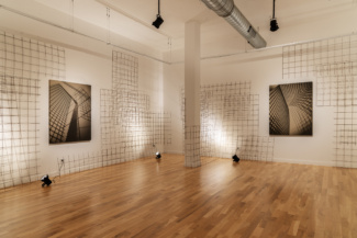 What is often hidden, the grid embedded beneath the façade of concrete structures, is dissected before it is rearranged as both surface and subject. Through this gesture of deconstruction, Kasten presents a vision of space that is turned inside out. The skeleton is the body, nothing more is needed to complete the building of the image. Each composition holds the movement, gravity, and weight of tangible form through an exchange of atmosphere and material. In the recent Plan series, on view in her solo exhibition ARCHITECTURAL FICTION, Kasten establishes the apparent illusions intrinsic to how space is determined and altered through light in measured acts of construction, manipulation, and control. In the studio as much as in any environment, her work revolves around questions of perception, of how we see through a manifestation of the conditions that create an image or experience. The ethos of this experiment is echoed in the installation: a grid that extends from what is pictured within the image, mediated by the camera, to what is in the space, mounted upon the wall and extending onto the floor to enclose the edges of the work. Wrapping the architecture of the gallery and the canvas supports in equal measure, Kasten dissolves the boundary between what belongs to the image versus the environment—reflections of parameters, material presence, and negative space.