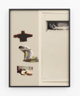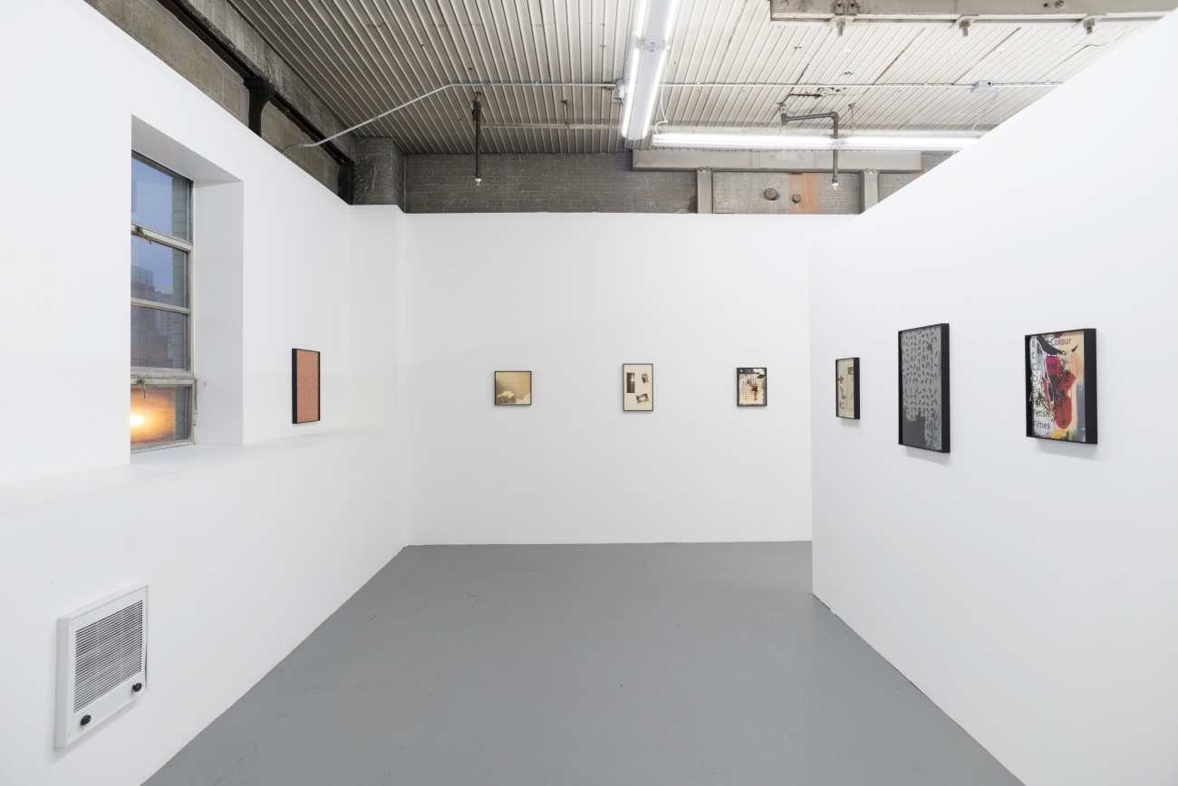 For this exhibition, Rafferty produced a new series of small-scale multimedia photographs using imagery from her own archive. Anonymous female subjects drawn from popular sources comprise one of the series’ motifs. Elsewhere, familiar images generate patterns and formal parallels. A mass of band-aids echoes an image of floor tiles, while a blue noose adds a sense of menace to an otherwise innocuous photograph of a blue necktie.