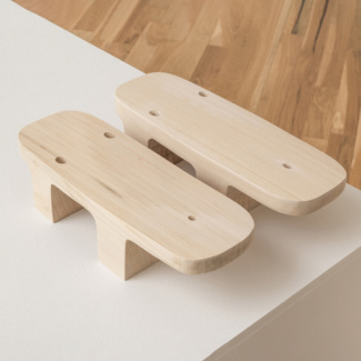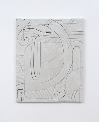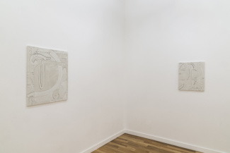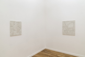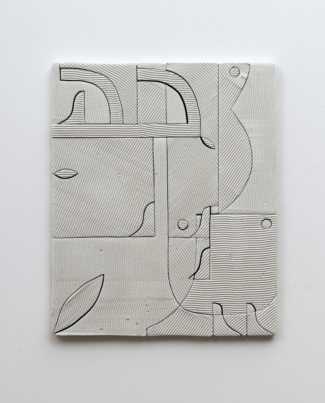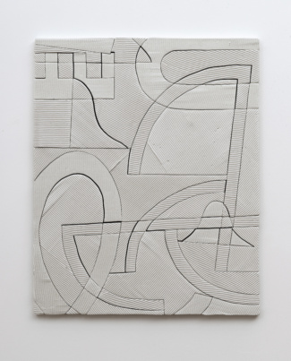 Four wall-hung mortar pieces hang alongside the scrolls, their white raked surfaces amplifying a patchwork of interlocking abstract forms. Like puzzles, they are pieced together, cut from a single rectangular plywood board. The image is whole but with voids and cracks where material was lost, like a ceramic bowl broken and glued back together. The pieces never fit exactly again. These spaces form a drawing, a playful and complex composition of intersecting shapes. Like the scrolls, the image is not drawn but made visible by shadow and light playing across a low-relief surface, telling the story of its own making.