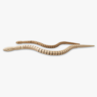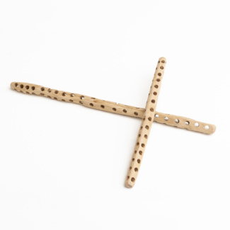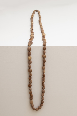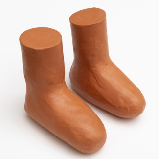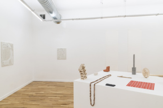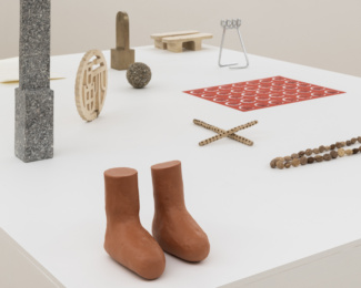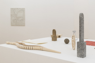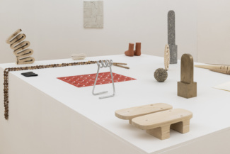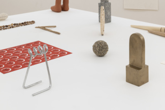 Elizabeth Atterbury’s work is scattered across low surfaces in her studio, a disorienting landscape of sculptural forms carefully arranged. Each mysterious object is presented with clarity, reduced to an icon of itself — a pair of clay feet, a necklace made from peach pits, two sticks riddled with regularly spaced holes, a signature chop carved from stone, a ball made of sand, paper perforated like postage stamps, the list goes on. Many forms are shifted in scale, enlarged recreations of original objects that sometimes undergo a material change. The objects never touch. Each occupies a space, each arranged with the deliberation of a museum display.