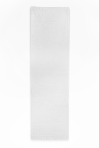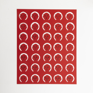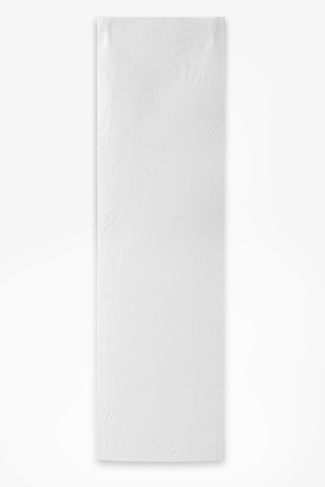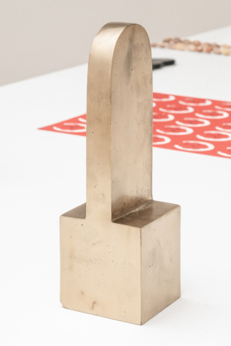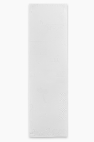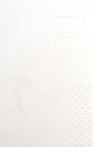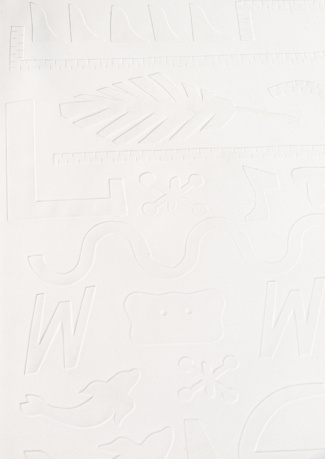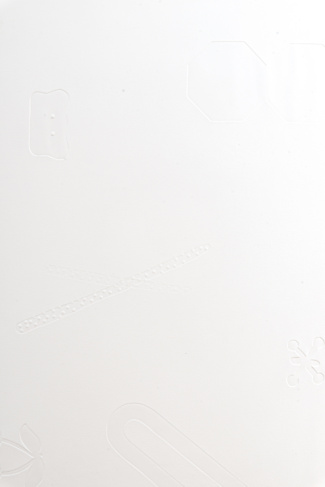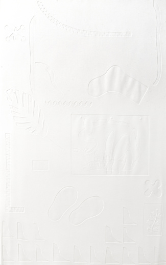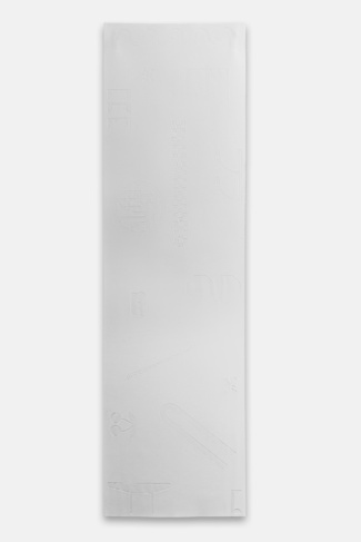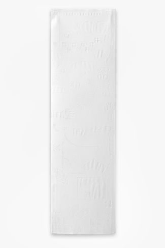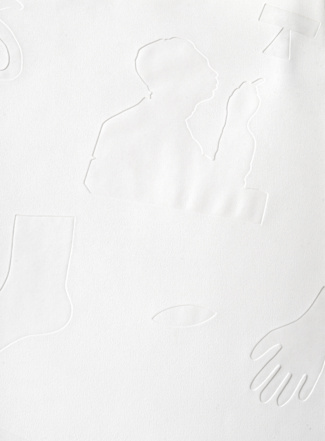 On the walls hang lengths of thick white paper — a series of scrolls — seemingly without image. At close range under raking light we find a field of blind-embossed shapes: the profile of a man, the outline of a child’s drawing, the number 2020, refrigerator magnet letterforms, a sock, a curlicue, a hand. One has the impression of a cross section, like geological strata, exposing objects trapped by mud, the fallen and lost remnants of a previous time but without nostalgia.