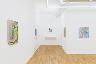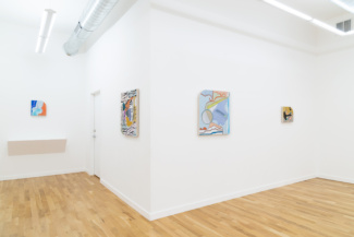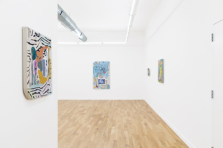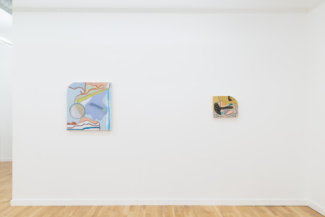 At first glance, Moon Tempo suggests a departure, and indeed an act of restraint, from the artist’s familiar shaped canvases. Filled with polyester to suggest pillowlike volumes and grid-like voids, these earlier paintings are as much about their sculptural facticity as the acrylic forms that adorn them yet remain beholden to the canvases’ idiosyncracies. In Lipke’s new works, the plane returns—even though the canvases, which utilize custom stretchers, are far from perfect rectangles. In each, one corner is elegantly curved, a gesture almost always echoed by some shape or other among the painted forms within. In addition, some corners of these paintings are gently pinched, reflecting the work of a fallible hand rather than any ninety-degree angle.