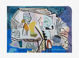 With the plane comes composition, pattern, and sign, the stuff of easel painting. Working in acrylic and gouache, Lipke alternates deftly between abstraction and vestiges of representational genres such as landscape, portraiture and still life. She is particularly fixated on line as both a contouring and patterning tool, setting up rigidly distinct areas of the painting on the one hand, and on the other threatening to overwhelm the composition with undulating threads of black paint. Colors tend toward muted pastels with occasional bursts of bright hues, such as the needle-like accent of yellow in Summer II, or the striking shade of luminescent blue in Metcalf’s Pond. Liffey, 2023, takes its title from a river in eastern Ireland located near several Paleolithic sites that the artist visited in her youth. It speaks to a consistent source of inspiration and veiled forms for Lipke: prehistoric cave painting. The intricate compositions can take months to complete.