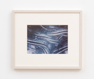 Pindell’s Video Drawings series is a meditation on the hegemony of the (tele)visual, one that forms a critique by way of the blur. In Pindell’s hands, blurring the image becomes a way to slow down the pace of image consumption in order to consider the multi-layered impacts of televisual images in everyday life. For these works, first Pindell drew an intuitive composition of lines and arrows onto sheets of acetate. These transparencies were then placed in front of a television screen, where the sheet would stick due to the static electricity that emitted from the screen. Sitting away from both the television and the camera propped in front of it, she would “watch” TV through the acetate, and decidedly take photographs with a cable release when she felt the image on TV compelled an interesting relationship with the drawn acetate composition.